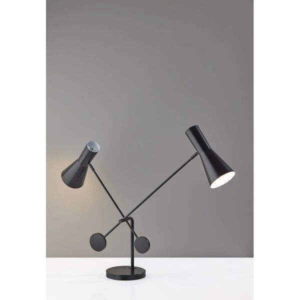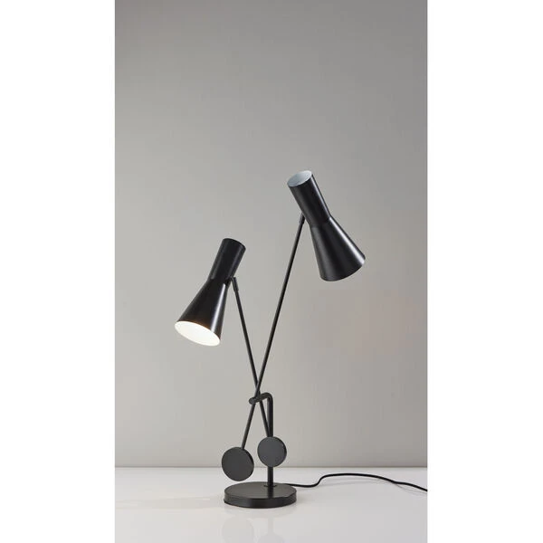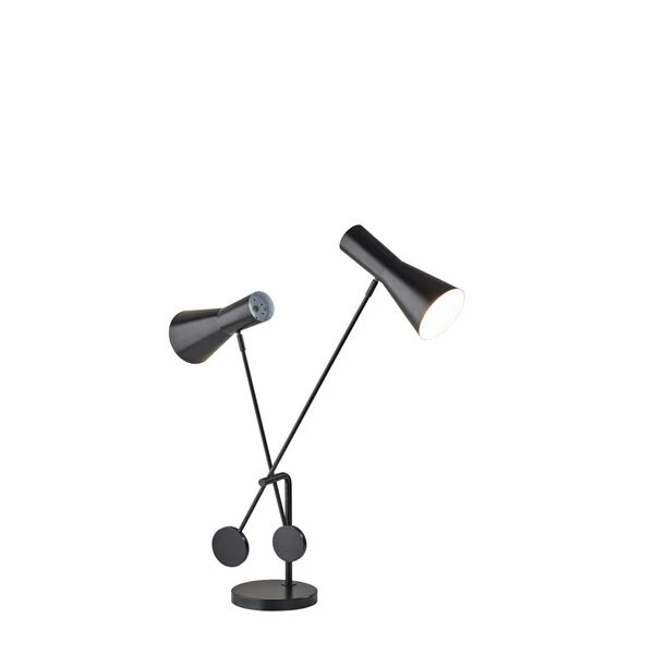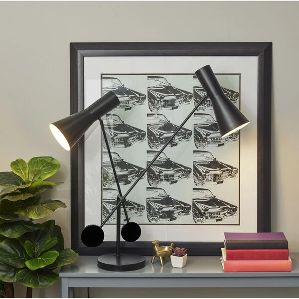 The Bond desk lamp by ADS360 is an artistic and functional statement piece to complete your modern industrial decor. Featuring two black cone metal shades affixed to two stems with round decorative ends, the lamp has a matching black metal stem and base. For maximum lighting and aesthetic versatility, both the direction of the shades and the angle of the stems can be adjusted to suit the spacing and lighting needs of any space. Based on the selected positioning, the desk lamp has a maximum height of 33.5 Inch and a maximum width of 36 Inch Inch es. The lamp’s base also features a discreet USB port to conveniently charge your phone or other devices. Operated by touch switches located on the shades, the Bond desk lamp powers two 40W Type A bulbs (not included) and features a 5′ black fabric-covered cord. Complete your interior design with the matching Bond floor lamp.