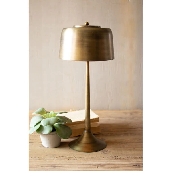 Looking for a classic yet updated look? Look no further than this antiqued lamp with an updated metal shade. Perfect at your bedside or you kitchen counter.