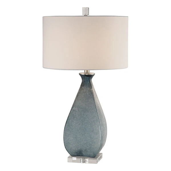 Deep ocean blue glass with an acid etched texture, accented with brushed nickel plated details and a thick crystal foot. The round hardback drum shade is a white linen fabric.