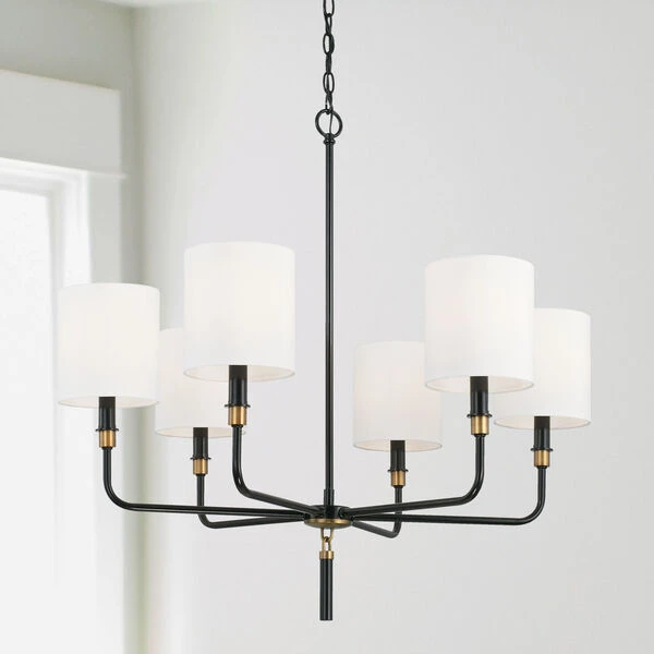 - Beckham Glossy Black and Aged Brass Six-Light Chandelier with White Fabric Stay Straight Shades