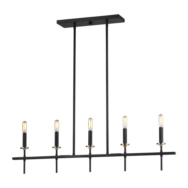 The Bryant five light kitchen island light in Midnight Black has a historical, raw material look with sturdy framing. An iconic fixture, this collection features an organic, linear design. The assortment includes a six-light chandelier and a five-light linear chandelier.