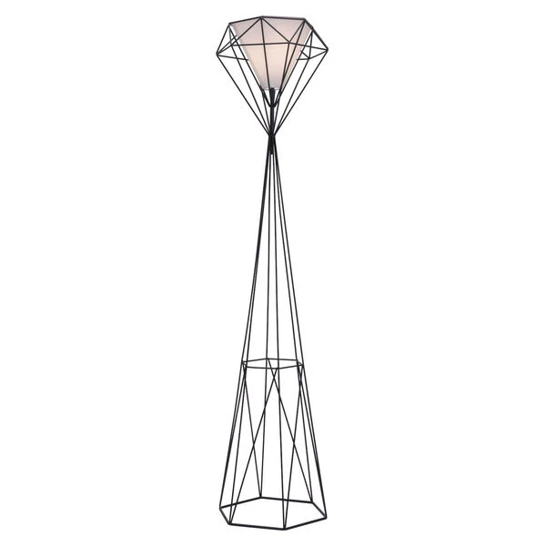 An architectural bent gives this floor lamp a place in any well-designed home. Its open construction exposes its structural supports and gives it an airy feel. Topped with a frosted glass shade that is enclosed in a diamond shape frame. Bulbs are not included, sold separately.