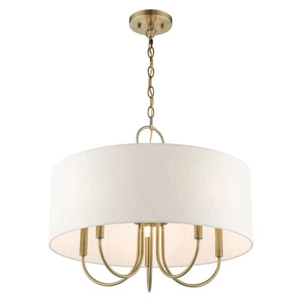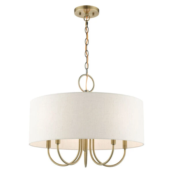 Add a touch of stylish sophistication with the Blossom series, a graceful transitional collection. Look no further if you crave to add warmth and richness to any formal or casual interior. The elegant curved arms suspended under the handcrafted hardback oatmeal colored shade will create a timeless feel to the living room, dining room or a bedroom. This meticulously crafted five-light pendant chandelier is shown in an antique brass finish.