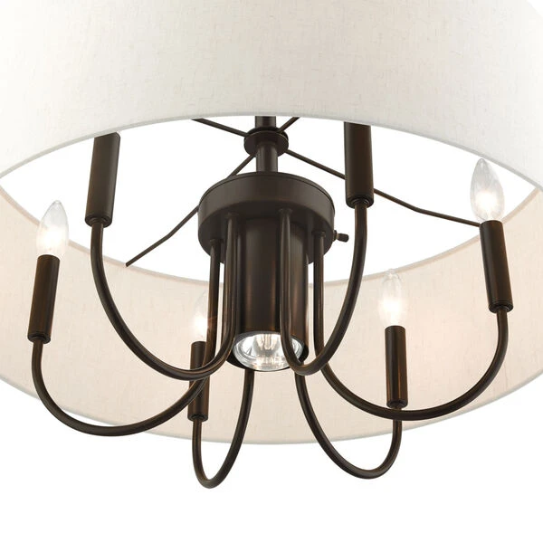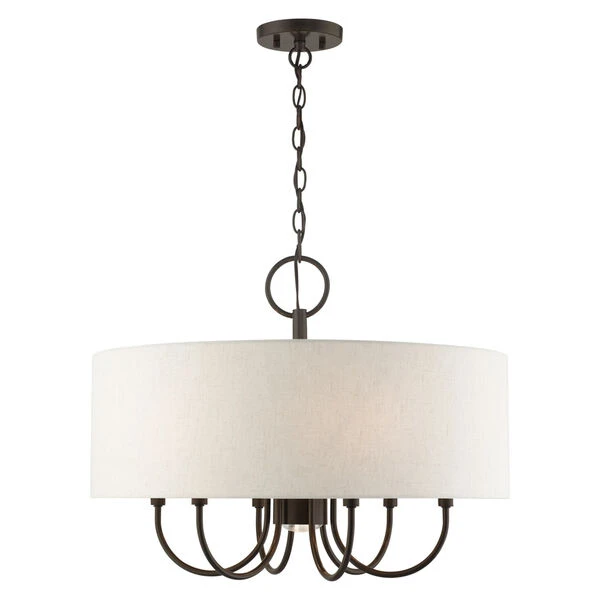 Add a touch of stylish sophistication with the Blossom series, a graceful transitional collection. Look no further if you crave to add warmth and richness to any formal or casual interior. The elegant curved arms suspended under the handcrafted hardback oatmeal colored shade will create a timeless feel to the living room, dining room or a bedroom. This meticulously crafted seven light pendant chandelier features a downlight and is shown in an English bronze finish.