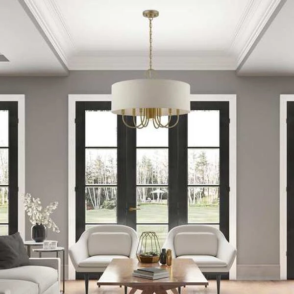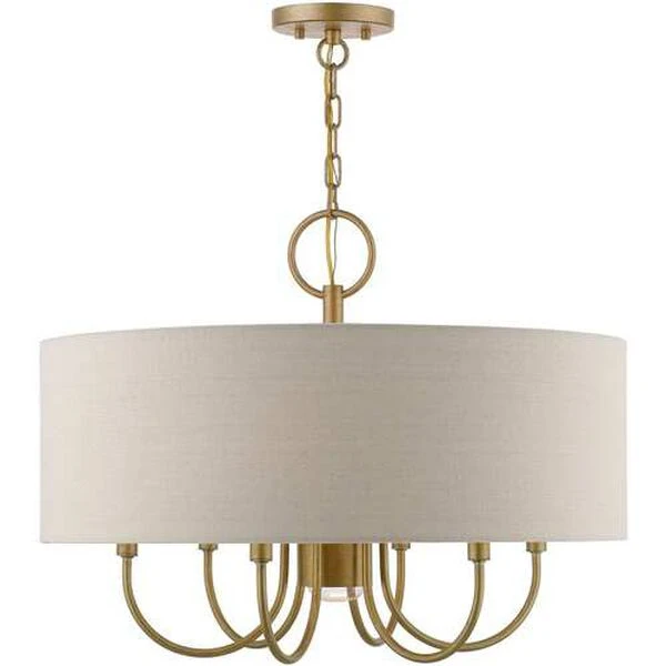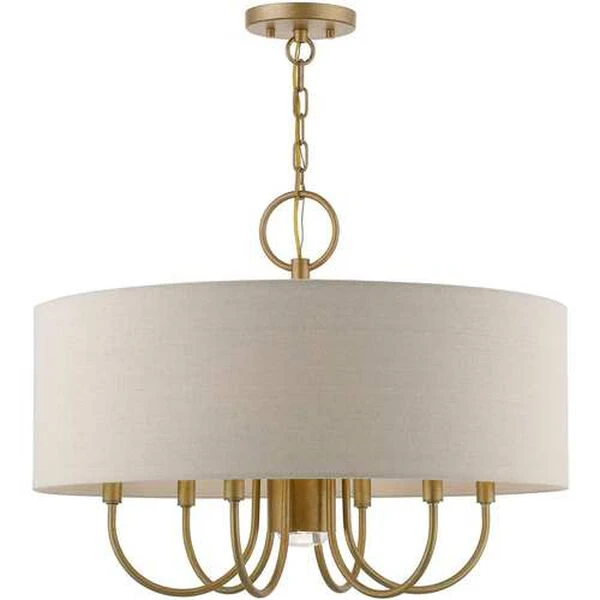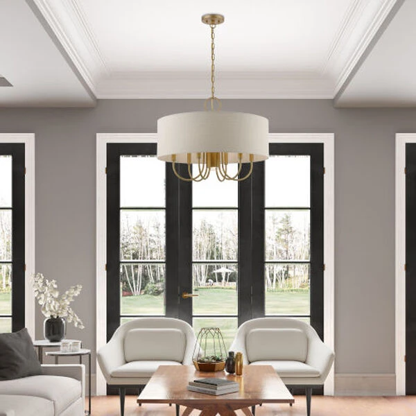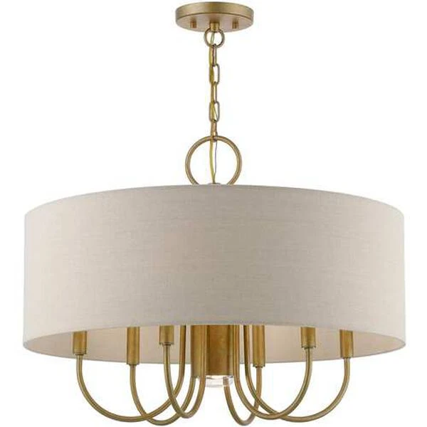 Add a touch of stylish sophistication with the Burnett series, a graceful transitional collection. Look no further if you crave to add warmth and richness to any formal or casual interior. The elegant curved arms suspended under the handcrafted hardback ash-gray colored shade will create a timeless feel to the living room, dining room or bedroom. This meticulously crafted seven light pendant chandelier features a downlight and is shown in an antique gold leaf finish.