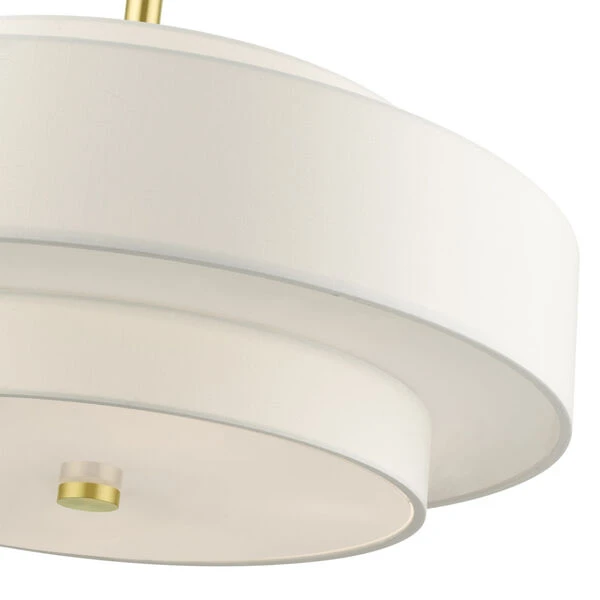 The Meridian collection has a clean, crisp look and contemporary appeal. The hand-crafted off-white fabric hardback shades offer a diffused warm light. This five-light multi-tier drum shade adds character to this handsomely styled pendant chandelier. Will adapt well in the living room, dining room or in the bedroom tastefully elevating your style. This sleek design is shown in a satin brass finish.