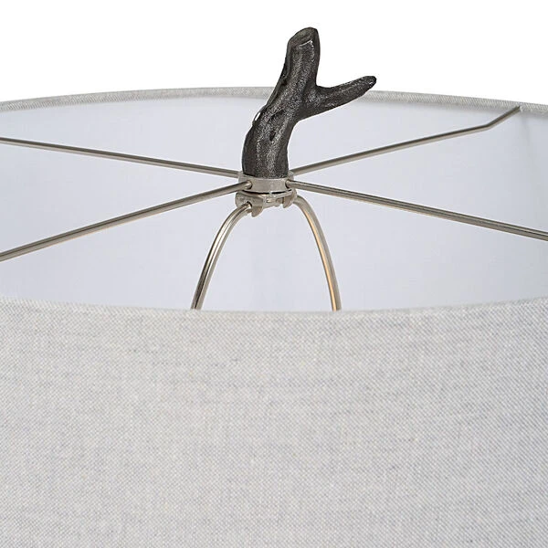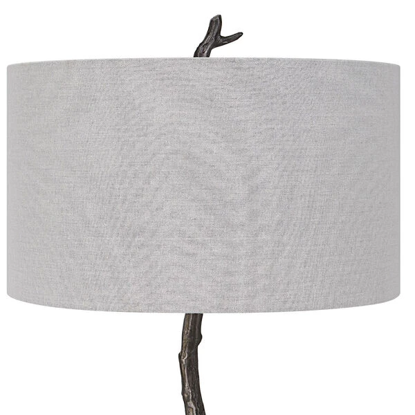 Drawing Inspiration From Nature, This Floor Lamp Is Handcrafted From Cast Iron With Sculpted Details Finished In Distressed Rustic Black And Subtle Silver Undertones. A Hardback Drum Shade In Light Gray Linen Fabric Accents The Piece.