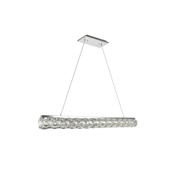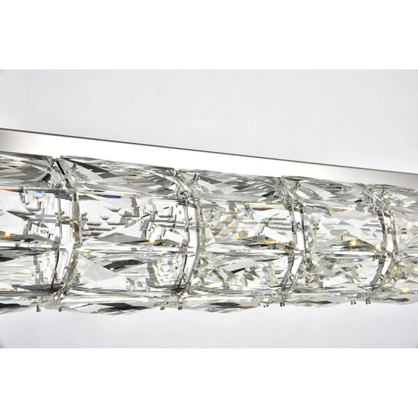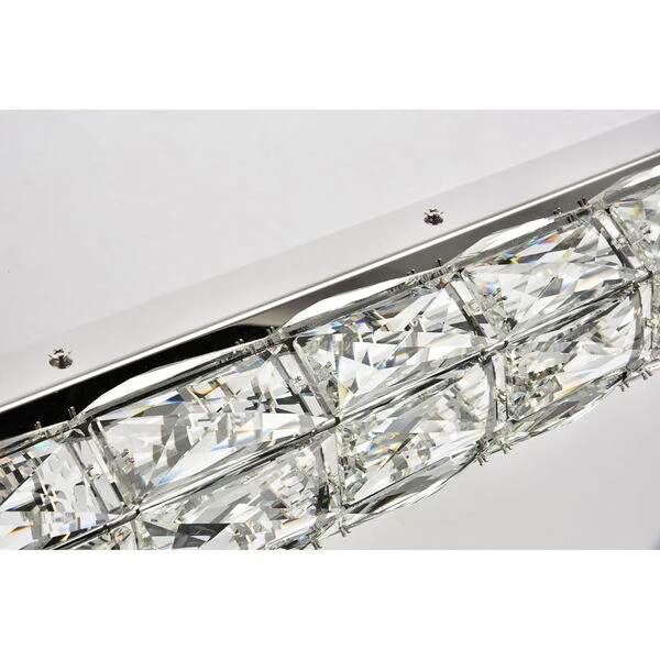 Valetta hanging fixtures dress up a living room, dining room, or bedroom without overwhelming the surrounding decor. This collection features an octagonal tube-shaped stainless-steel frame that’s covered almost entirely with shining rectangular royal-cut clear crystals. Faceted crystal octagonal crystals cover both ends as a charming finishing touch. A rectangular mounting plate is connected to the frame by slender cables that keep everything secure. A sleek chrome finish completes this modern look. Available in three different lengths.