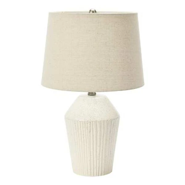 - Stoneware table lamp with white finish and natural linen drum shade